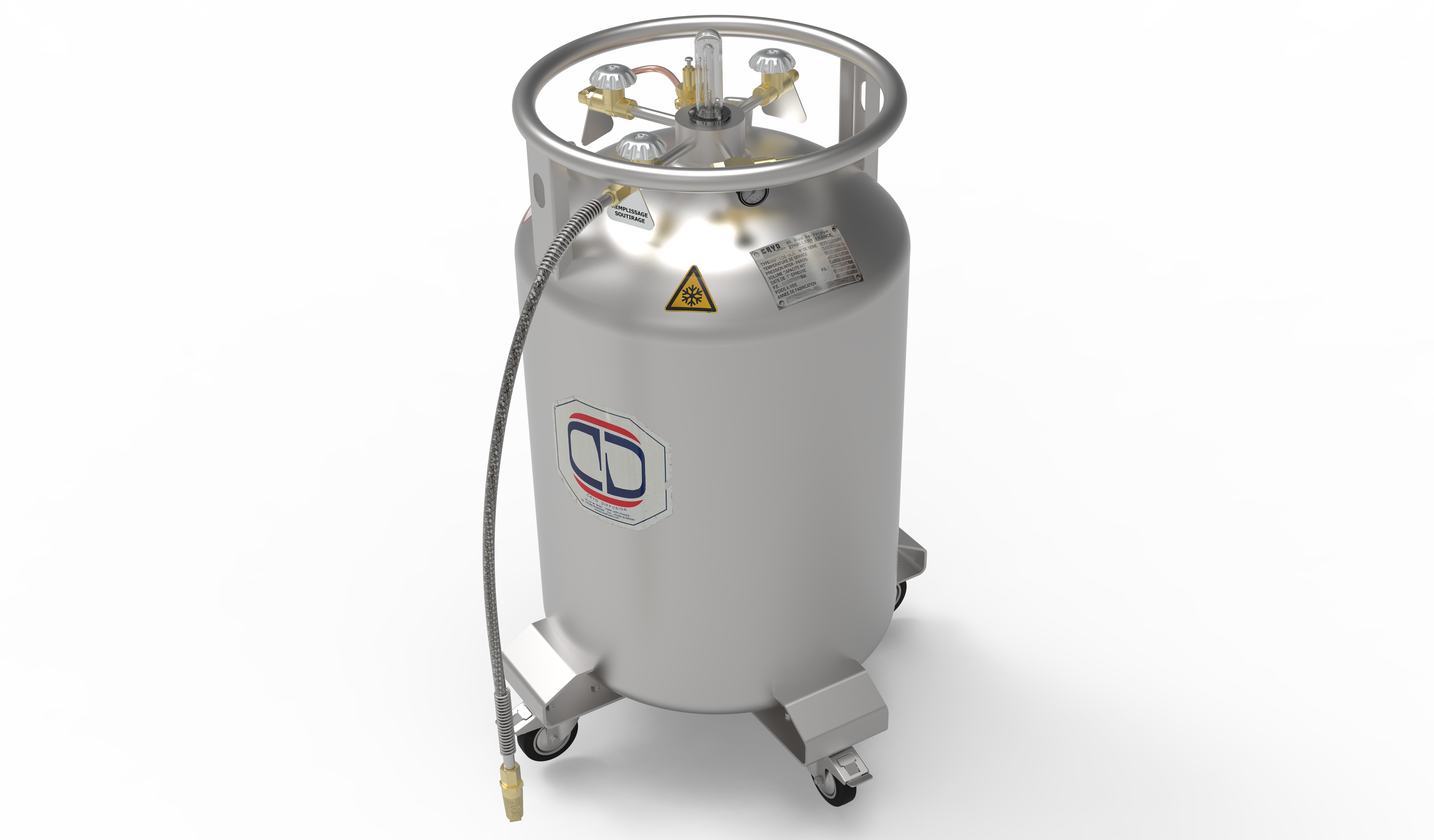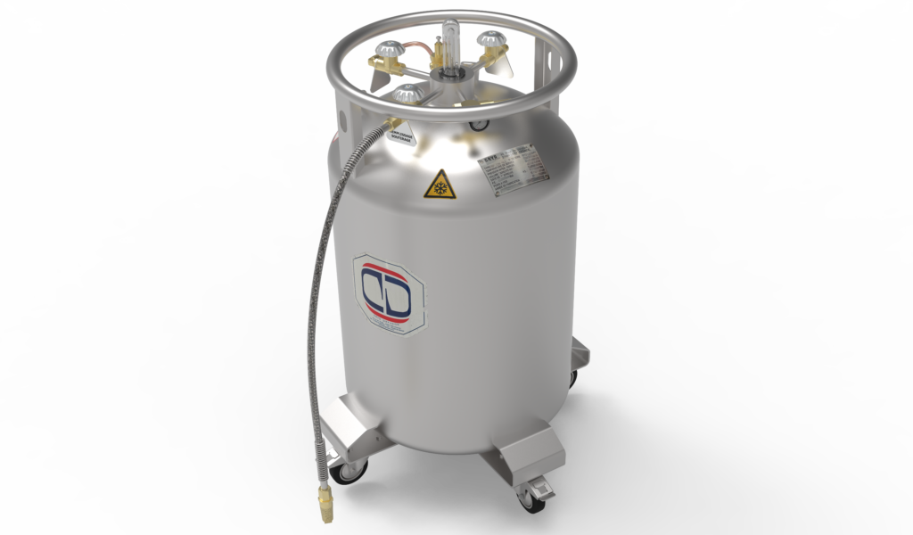 Modélisation fidèle d’un dewar de 130 litres d’azote liquide de marque Cryodiffusion®, avec son flexible de soutirage et un séparateur de phase.